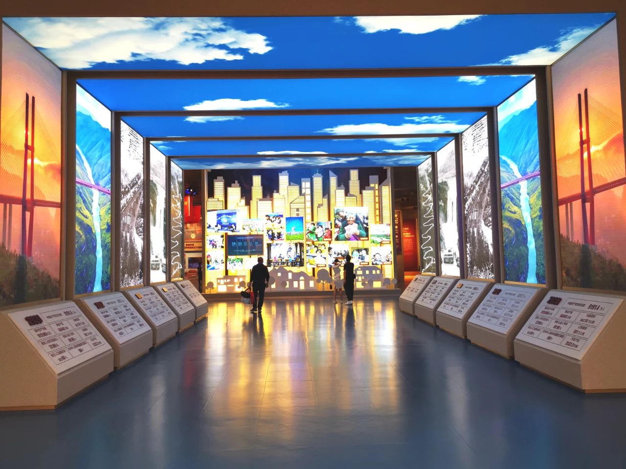 在百年长廊展示区,左右对称的超高清LED显示屏,用图片与视频资料,展示了中国共产党百年来带领中国人民从贫困走向富强,从胜利走向新的胜利的辉煌历程。